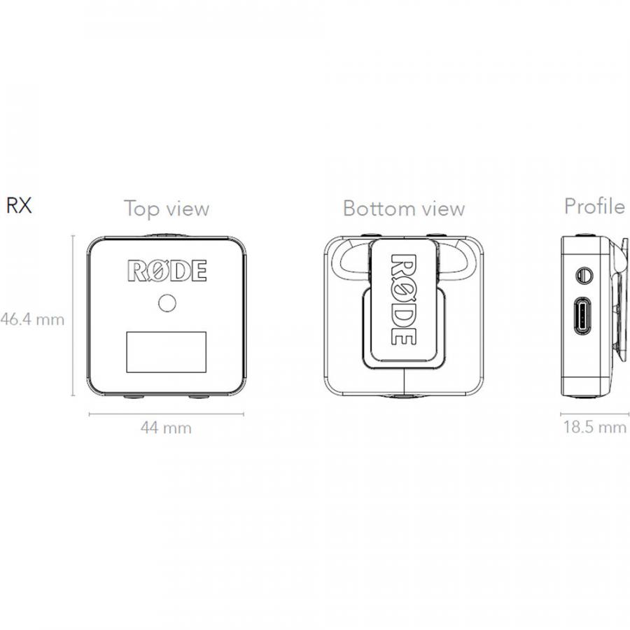 Prijímač (RX) je s rozmermi 44 x 46,4 x 18,5 mm a váhou 29 g tiež veľmi kompaktný a ľahký. Obsahuje viacúčelový držiak, vďaka ktorému je možné RX nasunúť do akejkoľvek kamery, prichytiť k odevu či opasku alebo jednoducho hodiť do vrecka. Dodáva sa s káblom TRS 3,5 mm pre priame pripojenie k audio vstupu kamery alebo iného kompatibilného rekordéra.