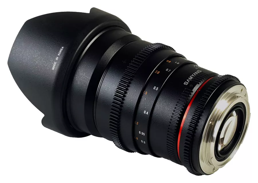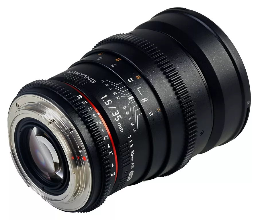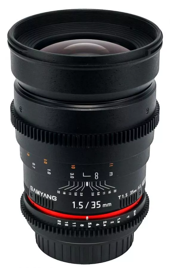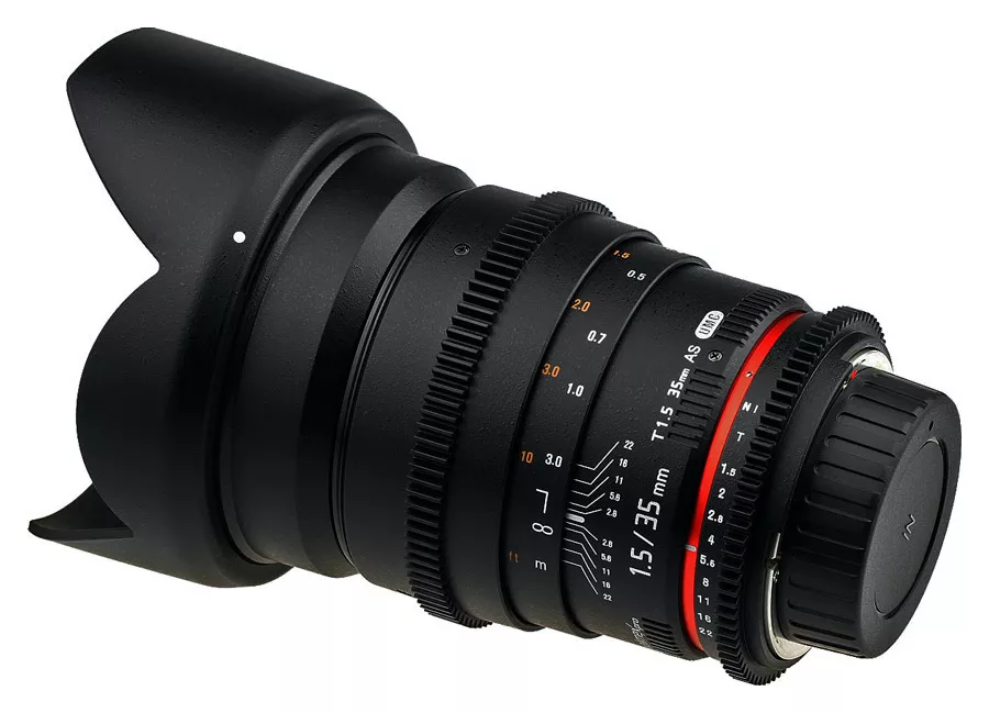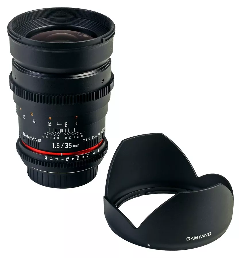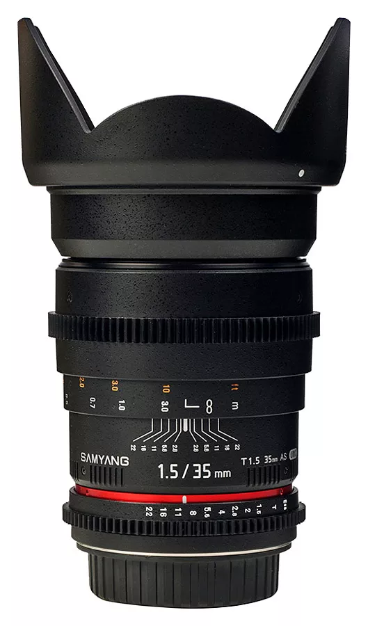 Samyang 35mm T1.5 AS UMC VDSLR je širokouhlý vysoko svetelný objektív optimalizovaný pre natáčanie videa, ktorý konštrukčne vychádza z objektívu Samyang 24mm f/1.4 AS UMC. Je určený pre použitie na Full Frame a APS-C digitálnych a klasických jednookých zrkadlovkách. Pri použití s Full Frame zrkadlovkami umožňuje objektív odfotografovať scénu s širokouhlým 63,4° uhlom záberu, ktorý vám výborne poslúži nielen v uzavretých malých priestoroch, na street fotografiu, ale aj na širokouhlé fotografie krajiny a architektúry. Pri nasadení na APS-C zrkadlovky vám poskytne objektív univerzálny štandardný uhol záberu 42,5° pri 52,5mm klasickej ohniskovej vzdialenosti po prepočte na kinofilm (1,5x crop faktor). Objektív má bajonetovú špeciálne tvarovanú (tzv. vykrajovanú) slnečnú clonu pre zabránenie vyniknutiu bočného svetla ktoré by mohlo zhoršiť výslednú obrazovú kvalitu.