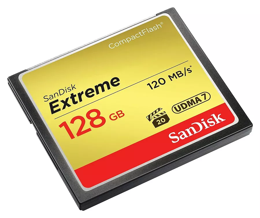 - Sandisk CF Extreme 128GB (VPG 20, UDMA 7) - R: 120 MB/s, W: 85 MB/s