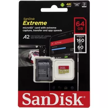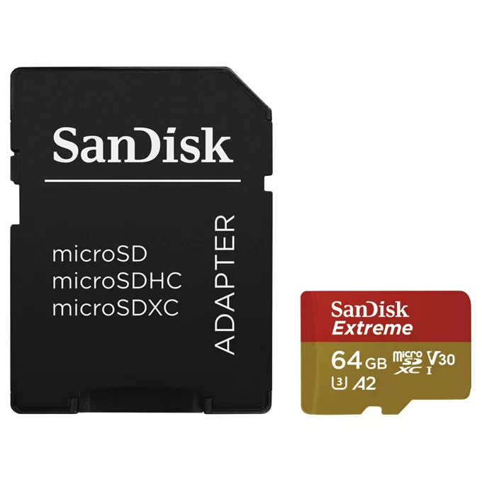 - SanDisk microSDXC Extreme 64GB 160 MB/s A2 C10 V30 UHS-I U3, adaptér