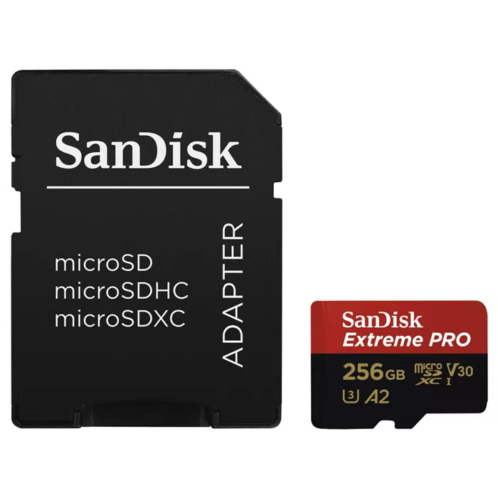 - SanDisk microSDXC Extreme PRO 256GB Class 10, UHS-I U3 V30, A2 - R: 200MB/s, W:140MB/s +Ad