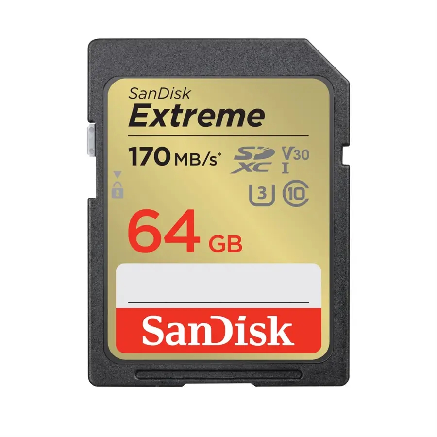 - SanDisk SDXC Extreme 64GB Class 10, UHS-I U3 V30, R: 170MB/s, W: 80MB/s