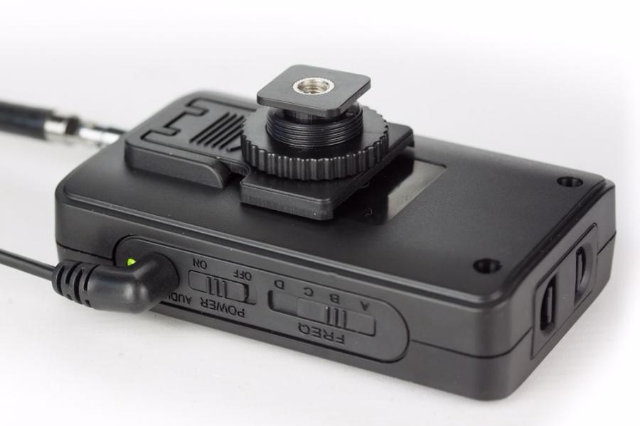 LED kontrolky indikujú stav batérie. Prijímač má vstavaný výstup pre slúchadlá, takže môžete monitorovať zvuk v reálnom čase aj v prípade, že váš fotoaparát tento výstup neobsahuje.