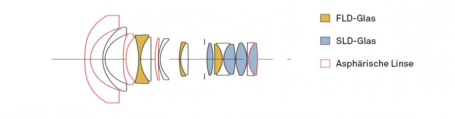 • Štyry SLD šošovky (Special Low Dispersion), tri FLD šošovky (F Low Dispersion), jedna veľká 80mm lisovaná asférická šošovka a štyri asférická šošovka v optickej sústave slúžia pre vykorigovanie chromatickej aberácie, zníženie odleskov, lepší prenos kontrastu, farebnú vernosť, vylepšenie ostrosti a vykorigovanie optického skreslenia obrazu.