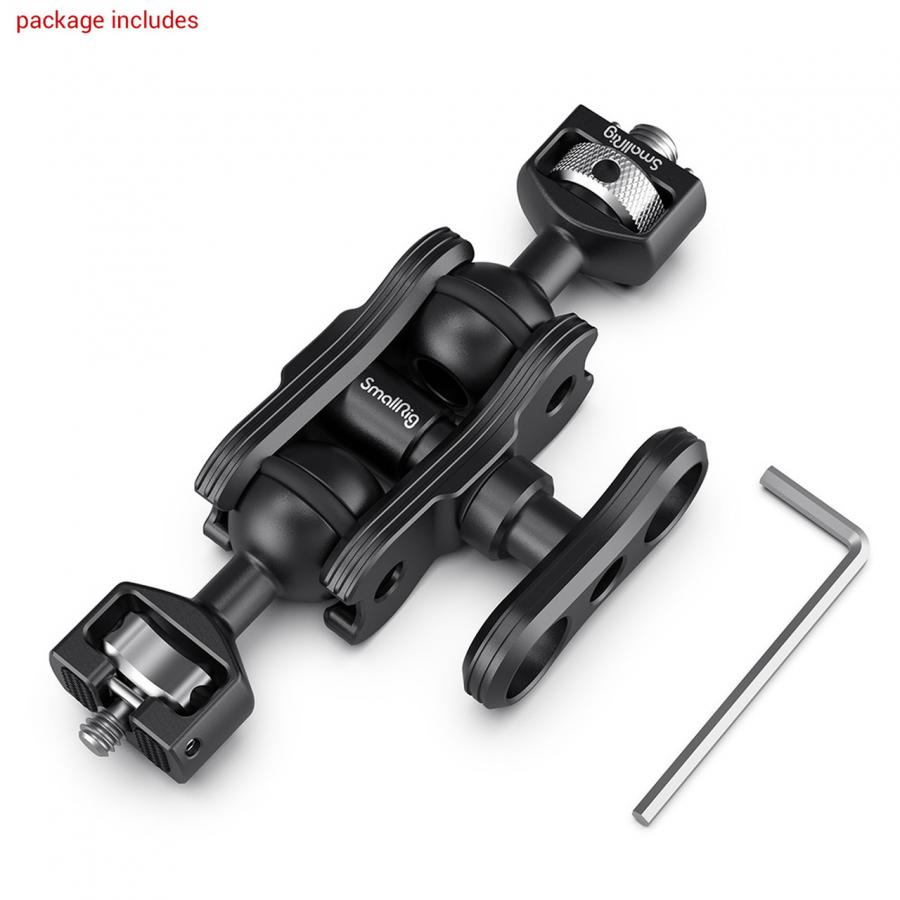 Kĺbové rameno SmallRig s dvoma guľovými hlavami (skrutka 1/4"-20 a polohovacia skrutka ARRI) 2115 možno použiť na pevné a flexibilné pripevnenie príslušenstva na kameru. Každý koniec obsahuje uťahovacie koliesko pre jednoduchú montáž príslušenstva s gumenými podložkami chráni zariadenie pred odieraním. Použite priložený malý šesťhranný kľúč na ďalšie utiahnutie otočného kolieska, ak je pripojené ťažké zariadenie. V porovnaní s jednou skrutkou 3/8”-16 je polohovacia skrutka ARRI oveľa bezpečnejšia s dvoma kolíkmi proti otáčaniu. Obidve guľové hlavy sú zaistené pomocou jednej veľkej palcovej páky. Toto rameno je kompatibilné so širokou škálou zariadení, ako je monitor, LED svetlo, ozvučenie atď., Toto rameno má nosnosť až 5 kg/11 lb. je zameniteľná s inými časťami guľovej hlavy SmallRig, ako sú 2132, 2134, 2211, 2114 pre rôzne montážne konfigurácie.