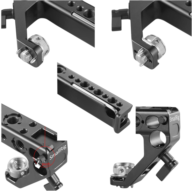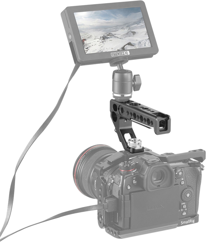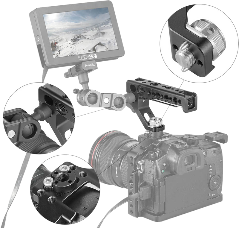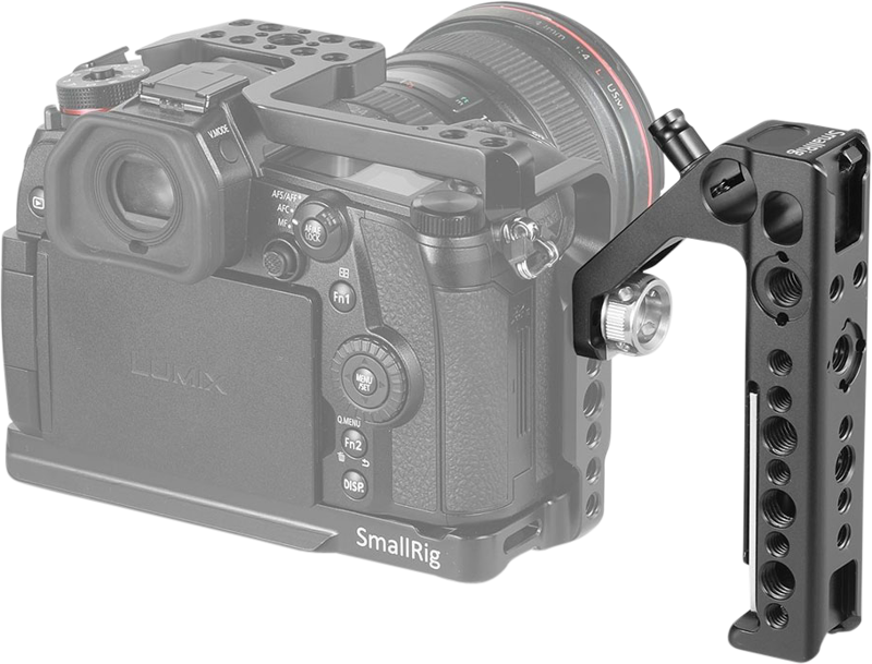 SmallRig ARRI Locating Handle 2165 is designed to attach to camera or cage via standard ARRI 3/8“-16 screw and provide multiple accessory mounts. The handle secures via the thumbscrew and allows to use the built-in hex spanner for further security to ensure safety. Featuring multiple 1/4"-20, 3/8”-16 and ARRI 3/8”-16 threads for accessories such as Monitor Mount 2294 and 2348. Integrates with three cold shoe mounts, with one of which is designed with an anti-removal pin allows mounting mic and light. The handle also offers a 15mm rod clamp for rod compatible accessories.