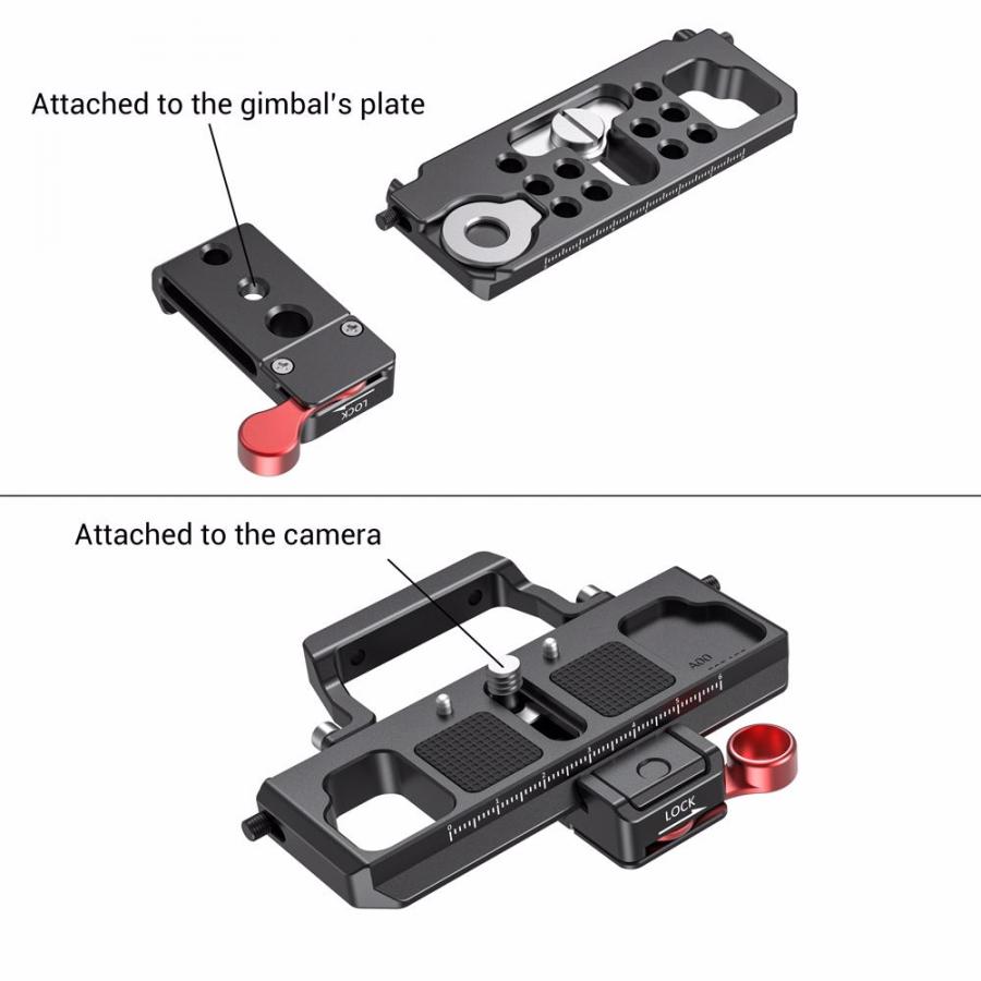 Dosku pripevnite k spodnej časti kamery pomocou skrutky 1/4 ", s kolíkmi proti pretočeniu a gumovými podložkami zabraňujúcimi krúteniu a poškriabaniu; zasuňte svorku do dosky a pripevnite ju pákou; celú súpravu pripevnite na gimbálovú doštičku.
