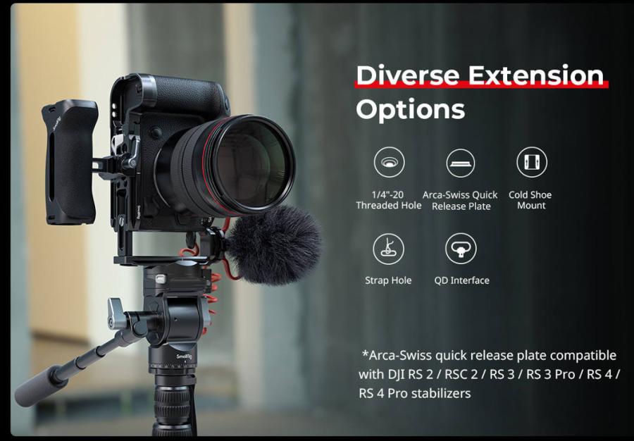 Montážna doska je vybavená viacerými rozširujúcimi rozhraniami vrátane otvorov so závitom 1/4"-20, QD rozhrania, držiakov na studené topánky a otvorov na popruhy, ktoré umožňujú pripojiť také príslušenstvo, ako je ramenný popruh QD, mikrofóny a statívy, ktoré sú vhodné pre rôzne scenáre snímania.