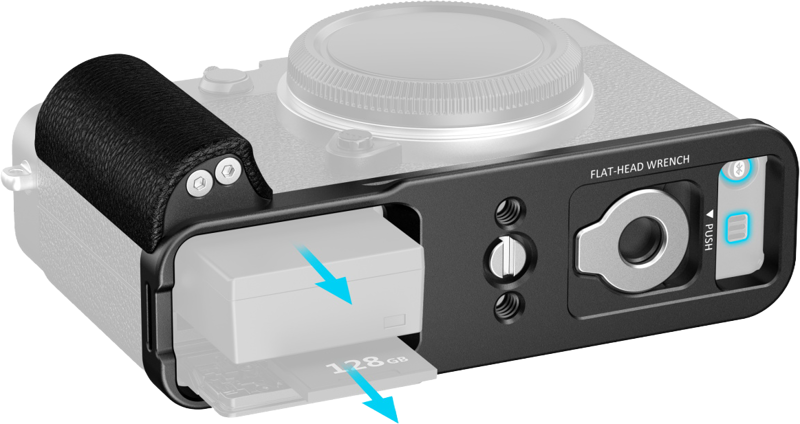 L-tvarová rukoväť umožňuje plný prístup ku všetkým rozhraniam fotoaparátu, vrátane priestoru pre batériu, prstenca zaostrovania, slotu na pamäťovú kartu a portov reproduktora.