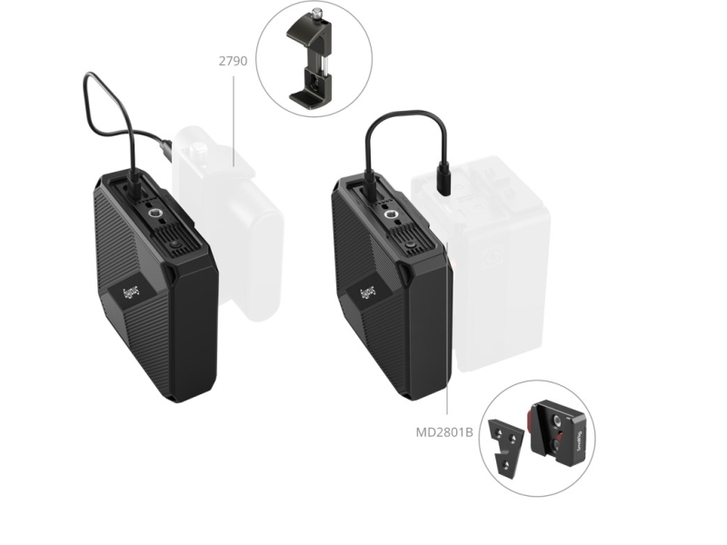 Viacero otvorov so závitom 1/4"-20 (na hornej, spodnej a bočných stranách) umožňuje umiestniť príslušenstvo SmallRig, ako je držiak powerbanky (2790) a mini V-lock montážna doska (2801), čím sa zabezpečí nepretržité napájanie z powerbanky alebo V-lock batérií.