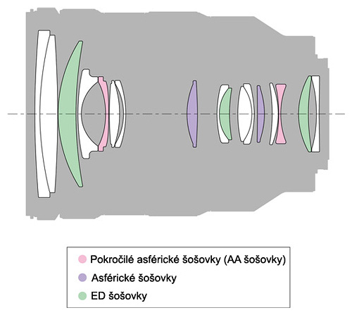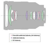 • Optická sústava objektívu pozostáva zo 17-tich šošoviek zoradených do 14-tich šošoviek z ktorých 4 sú asférické šošovky pre korekciu skreslenia obrazu a 3 sú z nízkorozptylového ED skla, ktoré zlepšuje prenos kontrastu a potláča chromatickú chybu