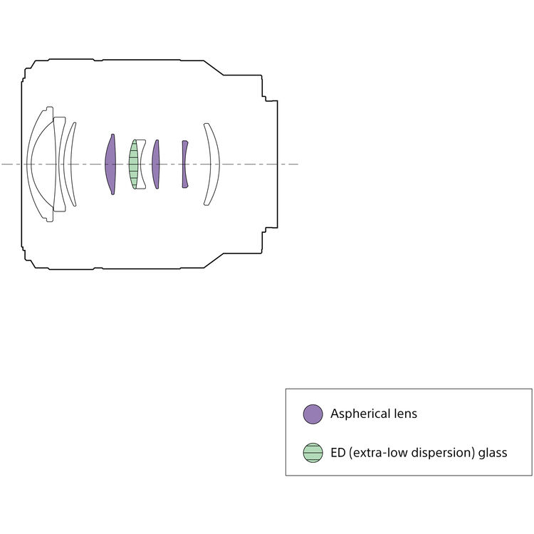 V konštrukcii objektívu je použitý jeden prvok zo skla s extra nízkou disperziou, ktorý pomáha redukovať chromatické aberácie a farebné lemovanie, čím sa dosahuje lepšia jasnosť a neutralita farieb. V konštrukcii objektívu sú zabudované tri asférické prvky na zníženie astigmatizmu, zakrivenia poľa, kómy a iných monochromatických aberácií.
