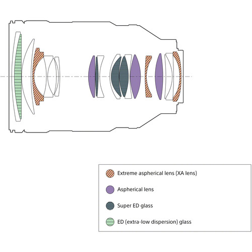 Originálna povrchová úprava Nano AR Coating II od spoločnosti Sony minimalizuje vznik odleskov a duchov. Optika navrhnutá tak, aby potláčala vnútorné odrazy, zabezpečuje ďalšiu odolnosť proti odleskom a vysokú ostrosť, kedykoľvek sa v zábere objaví silný zdroj svetla. Optika G Master poskytuje vynikajúci, jemný bokeh pre hlboké, priestorové snímky vďaka starostlivej kontrole sférickej aberácie vo fáze návrhu i výroby pomocou prvkov XA a novo vyvinutej clonovej jednotke s 11 lamelami. Sklenené prvky Super ED (s veľmi nízkym rozptylom) a ED navyše účinne obmedzujú chromatickú aberáciu.