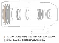 • Jedna XLD (eXtra Low Dispersion) a päť LD (Low Dispersion) šošoviek v optickej sústave slúžia pre vykorigovanie chromatickej aberácie, zníženie odleskov, lepší prenos kontrastu, farebnú vernosť a vylepšenie ostrosti.