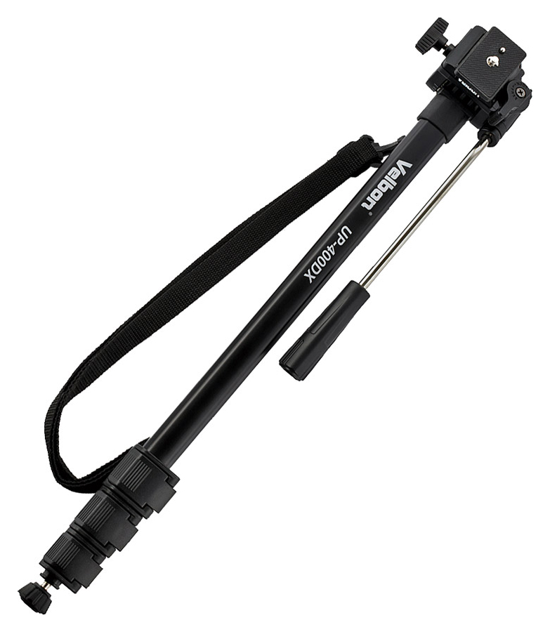 Velbon UP-400DX je ideálny pre fotografovanie športu a v situáciách, kedy musí fotograf pružne reágovať na situáciu a meniť svoju pozíciu. Určený je najmä pre prácu so systémovými fotoaparátmi, EVF zrkadlovkami a ultrazoom digitálnymi fotoaparátmi. Vyznačuje sa nízkou hmotnosťou, malými rozmermi, rýchlou prípravou do „pracovnej“ polohy a slušnou nosnosťou vzhľadom na svoju váhu. Velbon UP-400DX je vyrobený z moderných mimoriadne pevných hliníkových zliatin, ktoré účinne eliminujú vibrácie. Aretácia jednotlivých dielov štvordielnej nohy je vyriešená pomocou upínacích aretačných páčkových svoriek. Prvý diel nohy monopodu je potiahnutý machovkou (matnou polyuretanovou penou), ktorá spríjemňuje prácu s monopodom predovšetkým v chladnom počasí a navyše aj dobre tlmí vibrácie. Monopod je vybavený jednoduchou pákovou hlavou, ktorá je vybavená štandardnou rýchloupínacou doštičkou Velbon QB-4L. Na konci poslednej sekcie nohy má šróbovaciu gumovú pätku nasadenú na kovovom hrote. Monopody sú dodávané spolu s praktickým popruhom cez rameno a sú vyhotovené v elegantnej matnej čiernej farbe.