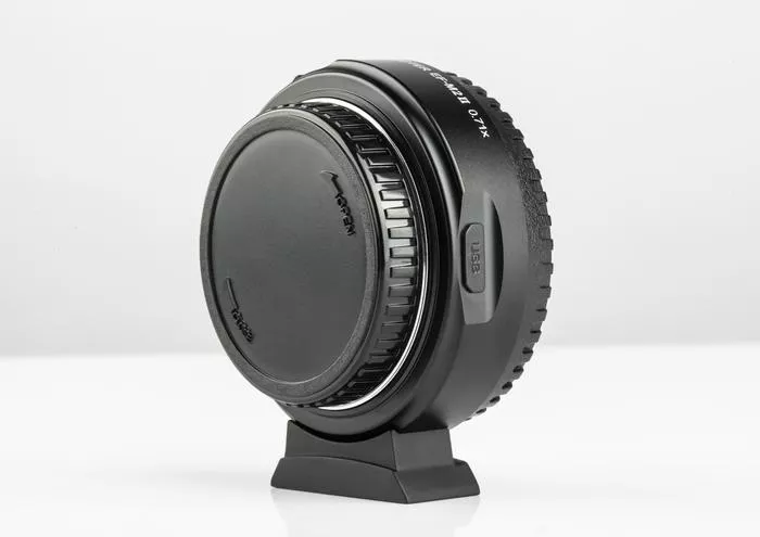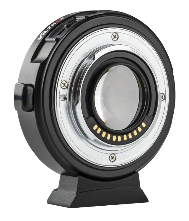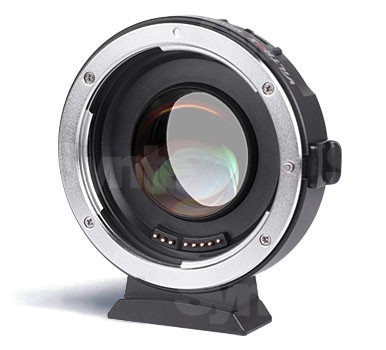 Tento „Speed Booster 0,71x“ značky Viltrox slúži nielen na prispôsobenie bajonetu MFT pre objektívy Canon EF, znižuje aj ohniskovú vzdialenosť objektívov (0,71x) a zvyšuje ich svetelnosť (až o jedno clonové číslo). Ponúka tiež 1/4" závit pre kamerové klietky a podporu AF. Rozmery 67x25 mm váha 85 g.