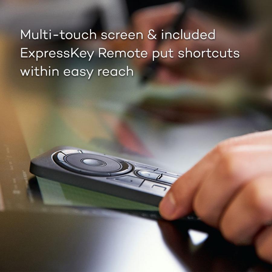 ExpressKey ™ Remote / Zvyšovanie produktivity Diaľkové ovládanie ExpressKey ™ sa 17 špecifickými nastaviteľnými tlačidlami pre aplikáciu, Touch Ring, Rocker Ring / tlačidlo Domov, presný režim, funkcia Display Toggle, Radial Menu a klávesnica na obrazovke, priradené časovo úsporné nastavenie posúvanie, scrollovanie, zoomu , veľkosti štetca